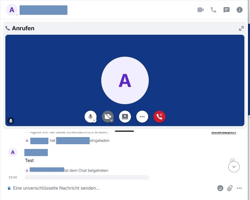 Sobald der Anruf angenommen wurde, öffnet sich dieser in einem neuen Fenster. Die Steuerung des Anrufs funktioniert genauso wie in regulären Videokonferenzen.