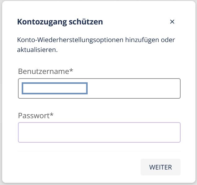 Hier haben Sie die Möglichkeit ihre E-Mail-Adresse zur Konto-Wiederherstellung zu aktualisieren. Dazu müssen Sie zuerst Ihre aktuellen Zugangsdaten eingeben und mit weiter bestätigen.