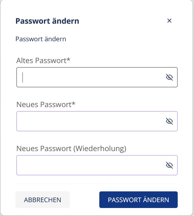 Hier haben Sie die Möglichkeit Ihr Passwort zu ändern. Geben Sie dazu ganz oben Ihr aktuelles Passwort ein. Geben Sie in der zweiten und dritten Reihe Ihr gewünschtes neues Passwort ein und bestätigen Sie mit Passwort ändern.