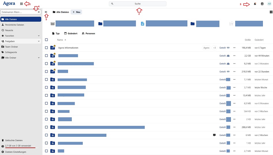 In der Menüleiste oben mittig finden Sie die Suche (2/Lupensymbol), mit der Sie Ihre Dateien und Ordner durchsuchen können. Oben rechts finden Sie drei Schaltflächen: Benachrichtigungen (3/Glockensymbol), rechts daneben Kontakte suchen (Personensymbol) und ganz rechts im Eck das Benutzermenü (Ihr Profilbild oder Namenskürzel). Über das Benutzermenü können Sie die Einstellungen und das Aussehen des Moduls anpassen, sich Abmelden usw.
