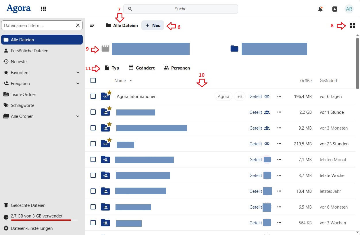 Im oberen Bildschirmbereich rechts neben der Schaltfläche zum Ein-/Ausklappen des Navigationsmenü befinden sich der Ordnerpfad sowie die Schaltfläche + Neu (6) zum Erstellen und Hochladen von Dateien. Alle Dateien (Ordnersymbol) ganz links im Pfad (7) führt zum Quellverzeichnis des Datenspeichers zurück. Ganz rechts auf gleicher Höhe finden Sie die Schaltfläche zum Wechseln der Dateiansicht (8/Kachel- oder Listenansicht).