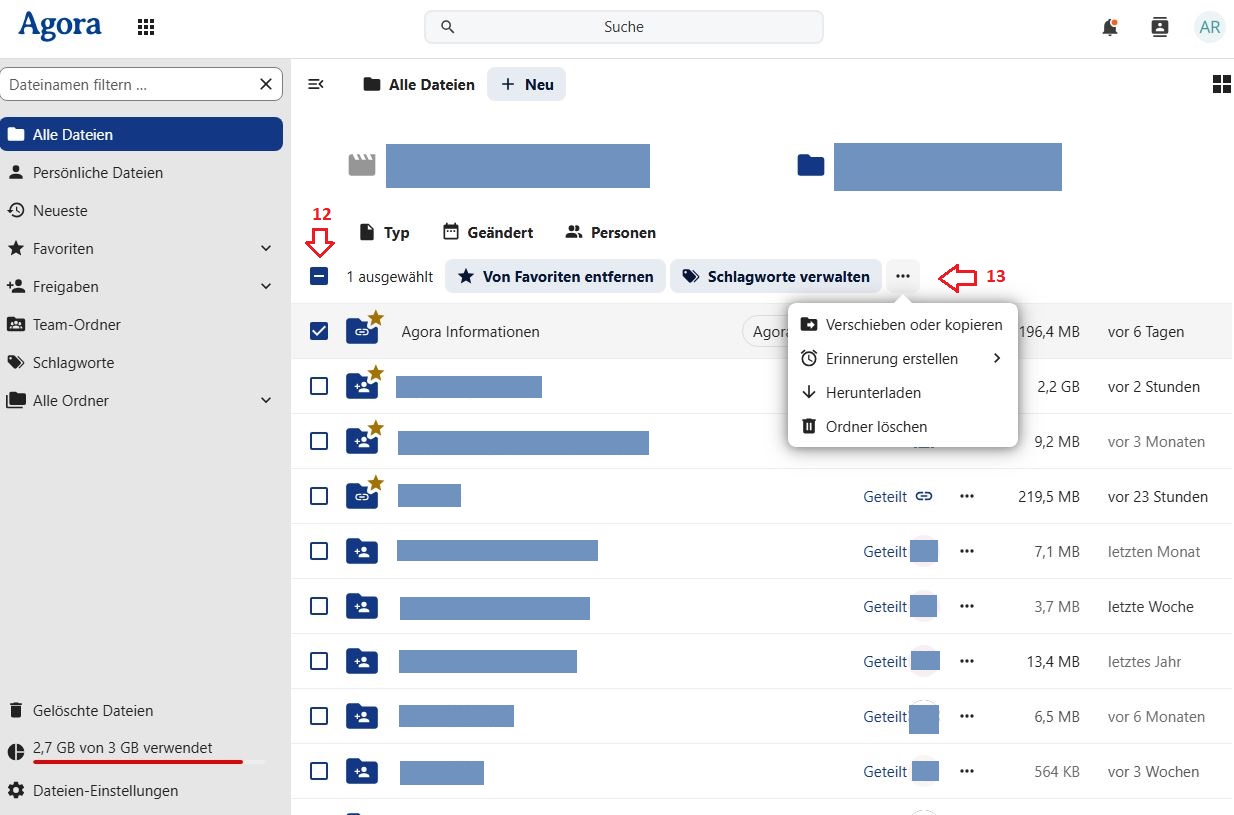 Wenn gerade Dateien und/oder Ordner ausgewählt sind (12), werden oberhalb der Dateiliste zusätzlich Schaltflächen für Verwaltungsfunktionen eingeblendet (13). Je nach größe des Fensters sind diese möglicherweise als Schaltflächen angezeigt oder im Dreipunkte-Menü zu finden.