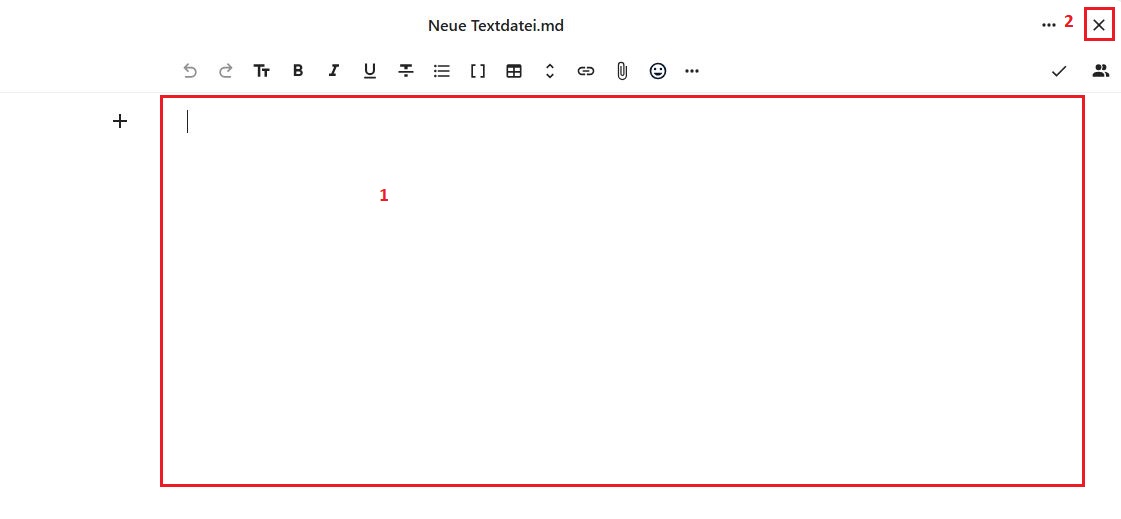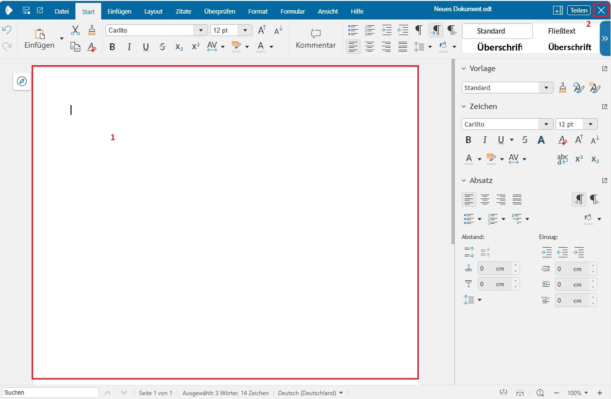 Um die geöffnete Datei zu bearbeiten, klicken Sie irgendwo auf die Arbeitsfläche (1). Diese befindet sich unter der Symbolleiste. Um die Datei zu schließen, klicken Sie oben rechts auf das Kreuz (2).