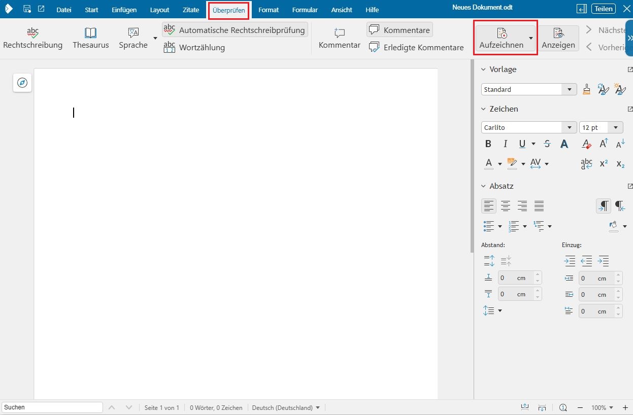 Hinweis: Wenn Sie eine .odt- Datei zusammen mit anderen Personen bearbeiten, denken Sie daran im Reiter Überprüfen die Schaltfläche Aufzeichnen zu wählen. Nur dann können alle durchgeführten Änderungen am Dokument später nachvollzogen werden.