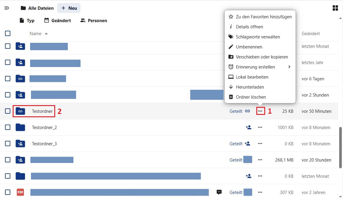 - Öffnen Sie das Kontextmenü durch klicken mit der linken Maustaste auf das Drei-Punkte-Menü rechts in der zugehörigen Listenzeile (1), oder