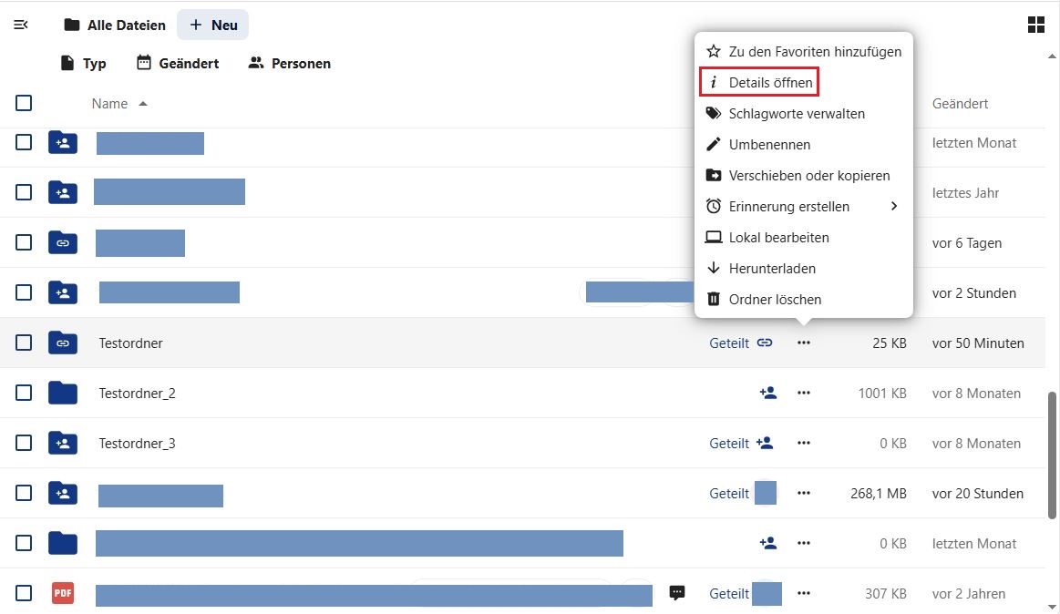 Die Seitenleiste bietet zusätzliche Funktionen für einzelne Dateien und Ordner. Um diese abzurufen, öffnen Sie zunächst wie oben beschreiben das Kontextmenü. Wählen Sie dann den Menüpunkt Details öffnen.