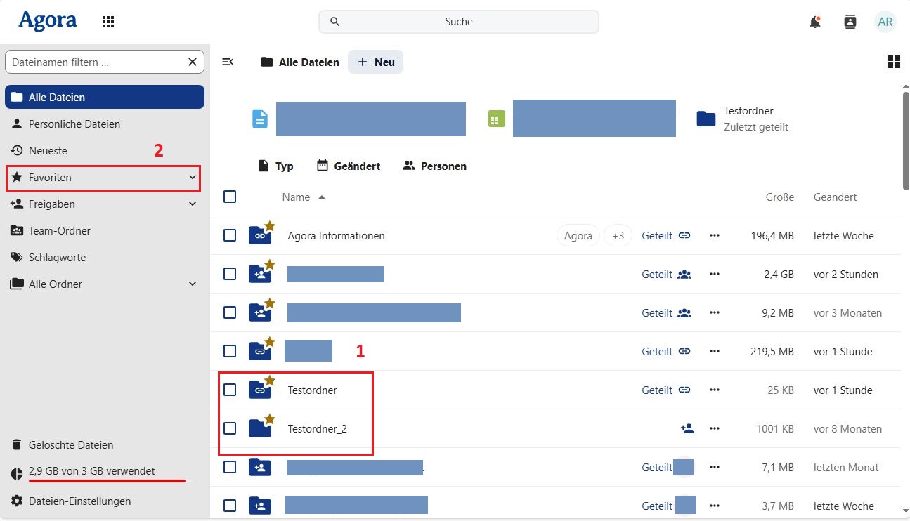 Favorisierte Ordner und Dateien erscheinen in der Auflistung aller Ordner und Dateien an oberster Stelle und sind mit einem gelben Stern versehen (1). Um nur Ihre Favoriten anzuzeigen, wählen Sie die Filteroption Favoriten aus dem Navigationsmenü auf der linken Seite aus (2).