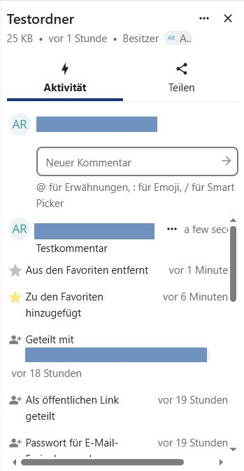Hier finden Sie eine Auflistung aller Aktivitäten, die im Zusammenhang mit der ausgewählten Datei stattgefunden haben (z. B. wenn eine Datei erstellt, bearbeitet oder zu den Favoriten hinzugefügt wurde). Die Aktivitäten werden mit Zeit- und Personenangabe in umgekehrt chronologischer Reihenfolge aufgelistet, das heißt die neuesten Aktivitäten tauchen immer ganz oben in der Liste auf. Sie können in diesem Abschnitt auch Kommentare veröffentlichen, beispielsweise um Ihre letzten Änderungen an der Datei einzuordnen. Klicken Sie dazu in das Feld Neuer Kommentar, geben Sie den gewünschten Text ein und bestätigen Sie mit der Eingabetaste oder durch klicken auf den Pfeil.