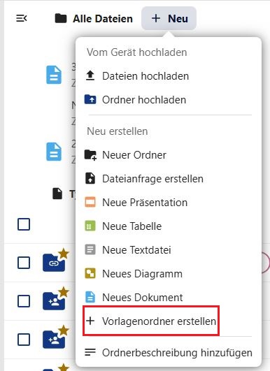 Sie können direkt in der Hauptansicht des Dateien-Moduls einen Vorlagenordner erstellen. Klicken Sie dazu auf die Schaltfläche + Neu oberhalb der Dateiliste und wählen Sie den Punkt Vorlagenordner erstellen.