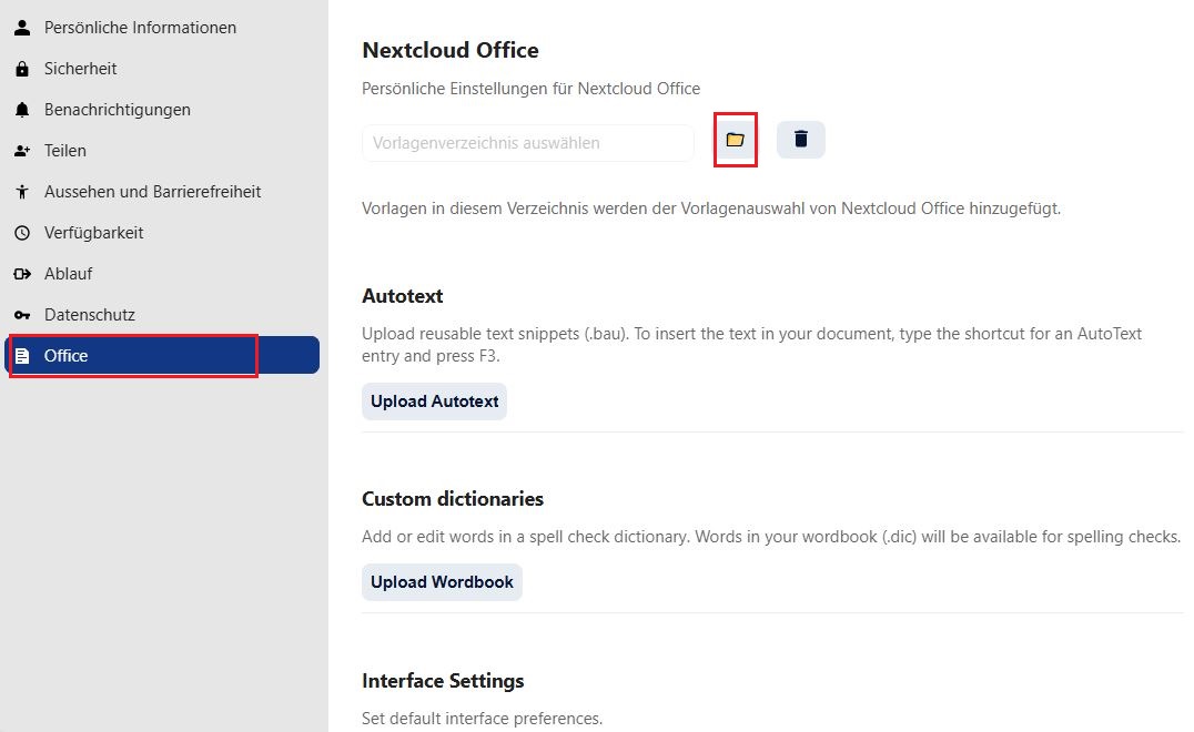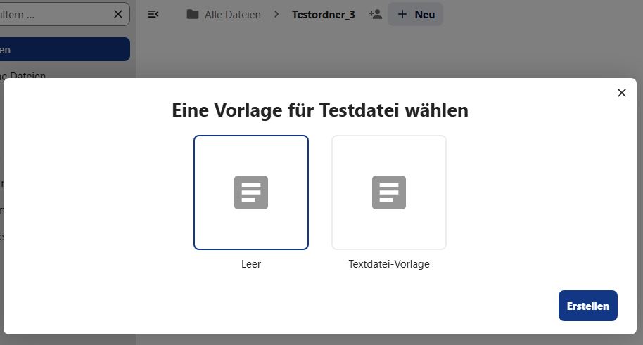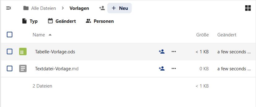 Hinweis: Als Vorlagen können nur Nextcloud-Dateitypen verwendet werden. Hochgeladene .docx-Dateien erscheinen nicht als Dokumentenvorlagen.