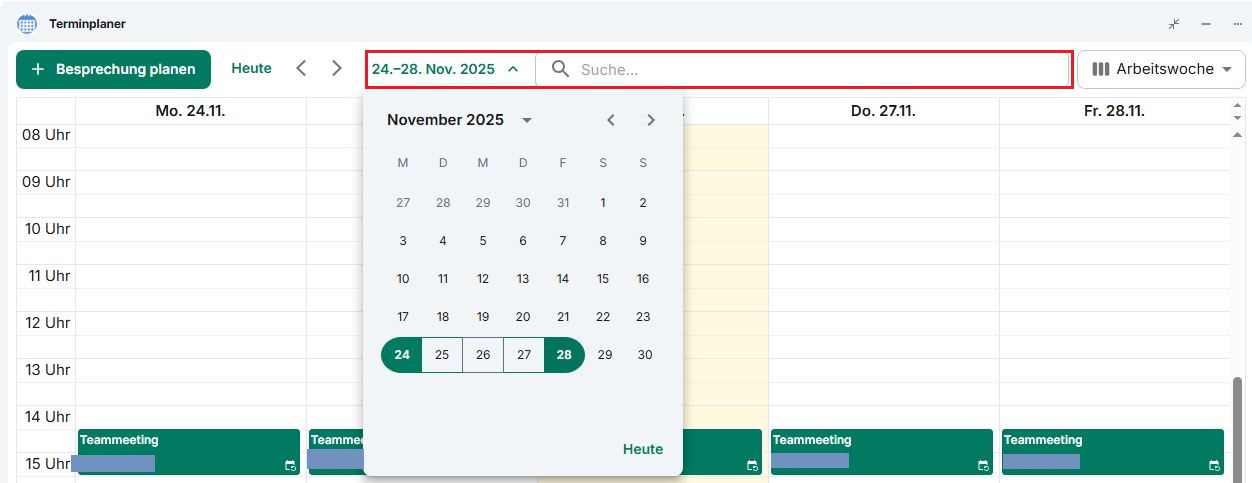 Der Terminplaner bietet einen Überblick über bevorstehende Besprechungen und ermöglicht die Organisation von Terminen. Dabei stehen unterschiedliche Ansichtsmodi zur Verfügung, die über das Dropdown-Menü oben rechts ausgewählt werden können: Liste, Tag, Arbeitswoche, Woche und Monat. Im Modus Liste werden alle bevorstehenden Termine chronologisch aufgelistet. Die anderen Modi zeigen jeweils nur die Termine des gewählten Zeitraums an.