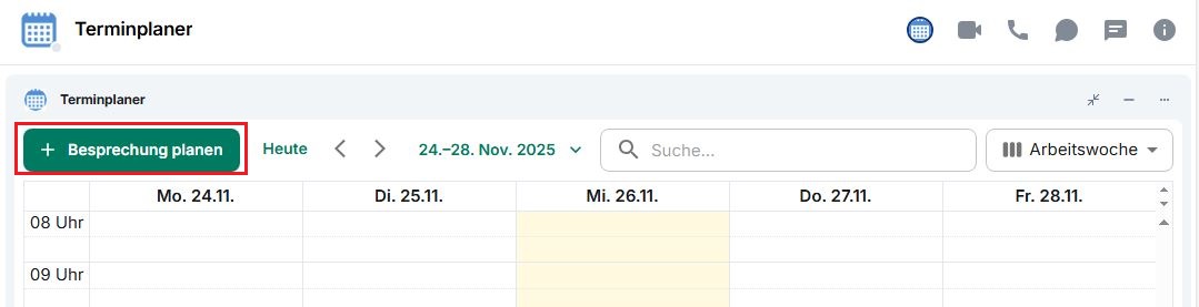 Verwenden Sie den Terminplaner, um neue Besprechungen einzurichten. Klicken Sie dazu auf die Schaltfläche Besprechung planen. Näheres zum weiteren Vorgehen erfahren Sie unter > Eine Besprechung planen.
