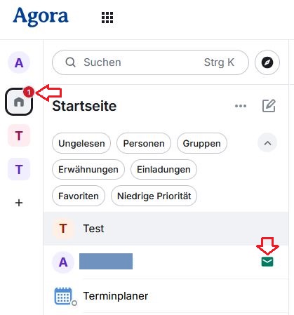 Benachrichtigungen über bevorstehende Besprechungen, Einladungen und Aktualisierungen zu geplanten Veranstaltungen werden Ihnen durch einen kleinen roten Kreis mit der Anzahl angzeigt sowie durch ein Brief-Symbol in der jeweiligen Zeile des Chat-/Besprechungraums. So bleiben Sie immer auf dem Laufenden und verpassen keine wichtigen Informationen.