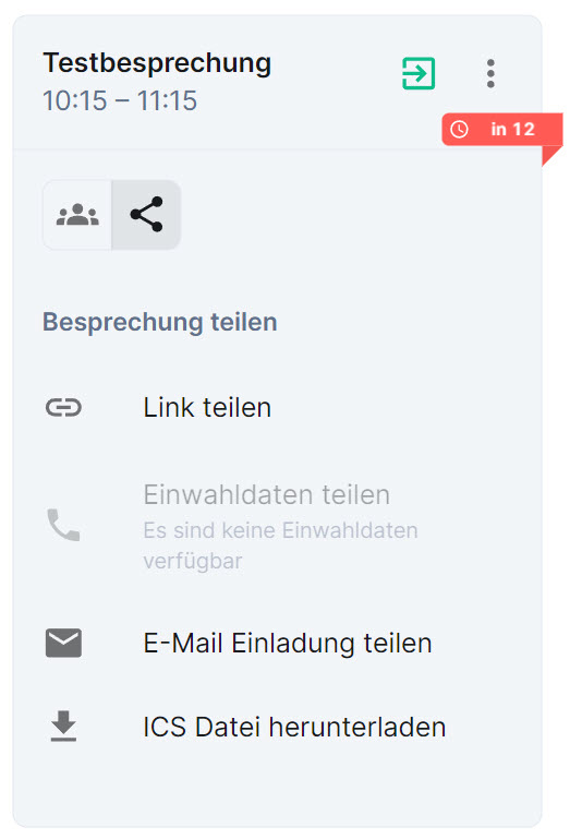 Darüber hinaus bietet der Terminplaner verschiedene Möglichkeiten, die Termine für Besprechungen mit anderen Nutzenden zu teilen. Um einen Besprechungstermin zu teilen, suchen Sie z.B. den gewünschten Termin im Terminplaner (Listenansicht) und klicken Sie auf die Schaltfläche Besprechung teilen (Teilensymbol).