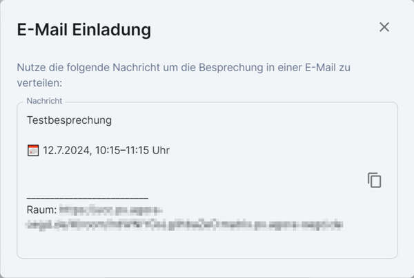 E-Mail-Einladung teilen: Erzeugen Sie eine E-Mail-Vorlage mit den Eckdaten des Termins (Raumname, Datum, Uhrzeit und Link). Die Vorlage wird in einem neuen Fenster geöffnet. Klicken Sie auf die Schaltfläche In die Zwischenablage kopieren rechts neben der Vorlage. Sie können die Vorlage auch vollständig auswählen und von Hand kopieren. Fügen Sie nun den kopierten Inhalt in eine E-Mail ein und senden Sie die E-Mail an alle gewünschten Personen.