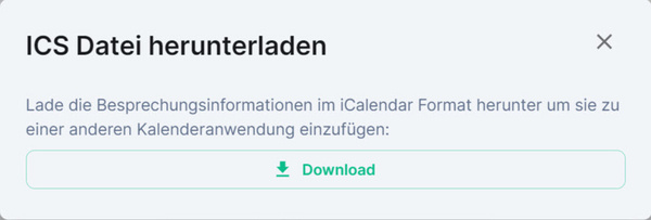 ICS-Datei herunterladen: Über diese Schaltfläche können Sie den Termin im iCalendar-Format herunterladen. Ein neues Fenster öffnet sich. Klicken Sie hier auf Download. Die erzeugte .ics-Datei kann in externe Kalender wie Outlook oder iCal importiert werden. Dies erleichtert die Integration in gängige Kalenderanwendungen.