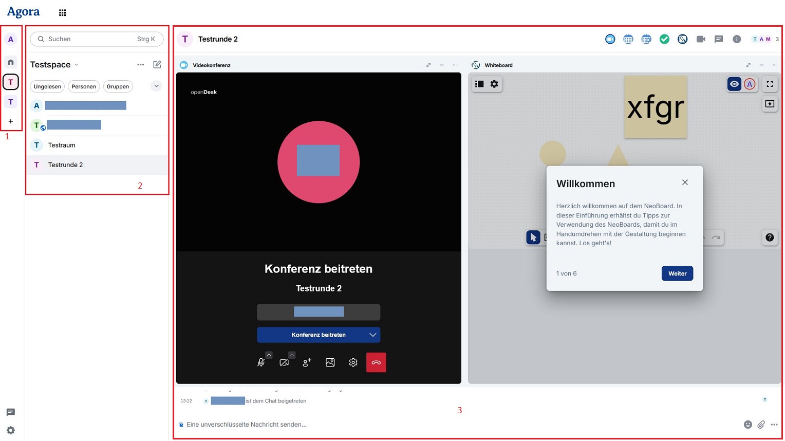 Rechts neben dem Hauptmenü, im mittleren Teil des Bildschirms befindet sich der Arbeitsbereich (3). Dort öffnen sich die Videokonferenz- (oder Chat)-Räume die Sie durch klicken im Hauptmenü links betreten.