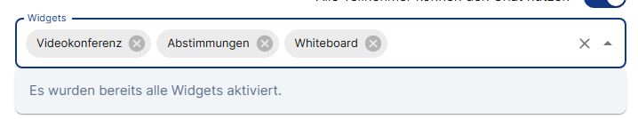 Beim Planen von Videokonferenzen werden standardmäßig alle Widgets aktiviert. Wenn Sie Widgets entfernen möchten, klicken Sie dazu neben dem Namen des Widgets auf die Schließen-Schaltfläche (X-Symbol). Sie können auch ganz rechts im Widget-Feld auf die Schaltfläche Leeren (X-Symbol) klicken, um alle Widgets zu entfernen. Beachten Sie, dass ausschließlich ein Chat zur Verfügung steht, wenn Sie eine Veranstaltung ganz ohne Widgets einrichten.