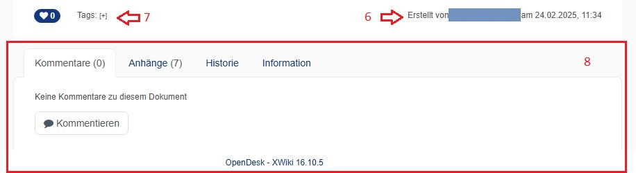 - Fußzeilenbereich: dort finden Sie ErstellerIn und Datum (ursprüngliche/r ErstellerIn und Erstelldatum) (6) sowie Tags (einige Kategorien, in die die Seite passt) (7)