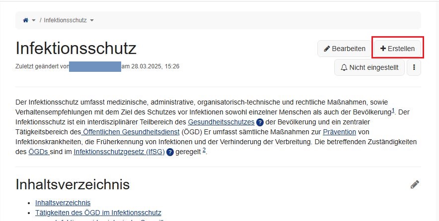 Klicken Sie zuerst auf der Hauptseite, welcher die neue Seite untergeordnet werden soll, auf die Schaltfläche +Erstellen. Versuchen Sie bitte Ihre neuen Seiten den bereits angelegten Themenseiten zuzuordnen und unterzuordnen. Wenn Sie z.B. eine Unterseite von “Infektionsschutz” erstellen möchten, gehen Sie zunächst auf den Wiki-Eintrag zu “Infektionsschutz” und klicken dann auf die Schaltfläche + Erstellen. Dadurch wird die neue Seite dem Eintrag zum “Infektionsschutz” zu- und untergeordnet.
