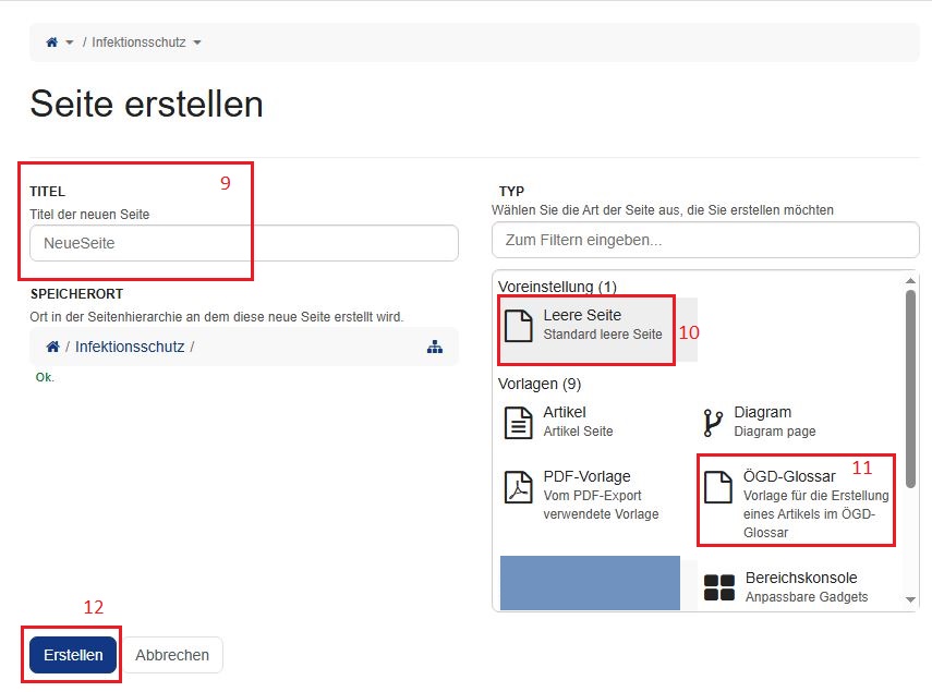 Sie gelangen als nächstes auf die in der nächsten Abbildung gezeigte Ansicht. Hier können Sie einen Titel für die Seite vergeben (9) und den Typ des Dokuments auswählen den Sie erstellen möchten. Wir empfehlen Ihnen als Dokumententyp Leere Seite (10) oder die Vorlage ÖGD-Glossar (11) zu wählen. Bestätigen Sie abschließend mit Erstellen unten links (12).
