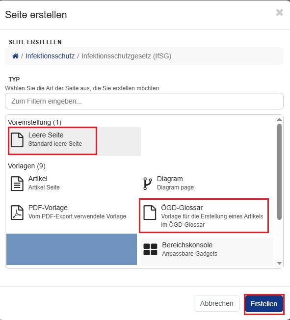 Wenn Sie auf einen solchen Link/Verweis klicken öffnet sich ein Fenster zur Auswahl des Dokumententyps. Wählen Sie auch hier den gewünschten Dokumententyp (wir empfehlen Leere Seite oder ÖGD-Glossar) und bestätigen Sie mit Erstellen.