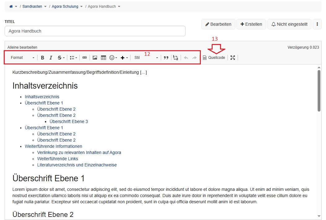 In der Standardansicht (WYSIWYG-Editor) haben Sie die Möglichkeit Ihren Text einzufügen/einzugeben und mit dem Toolbar/Werkzeugleiste zu bearbeiten (12). Der Text wird Ihnen direkt in der entsprechenden Formatierung und mit eingefügten Macros angezeigt.