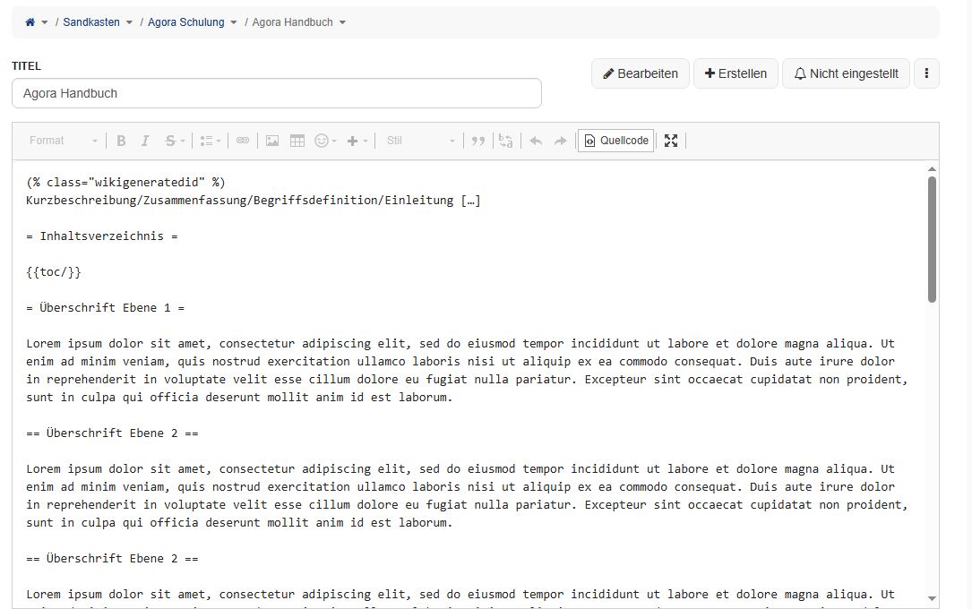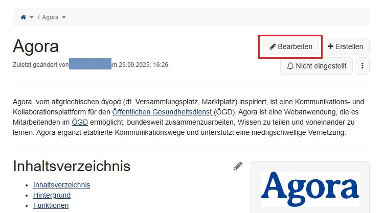Um eine Seite im Wiki zu bearbeiten, klicken Sie auf der betreffenden Seite Bearbeiten. Der Bearbeitungsmodus öffnet sich und Sie können den Inhalt direkt bearbeiten.