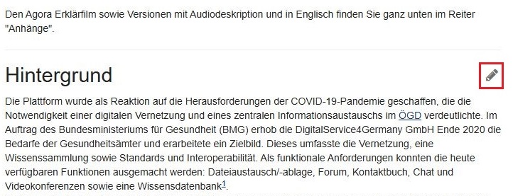 Alternativ können Sie auch auf das Stiftsymbol in den verschiedenen Abschnitten des Wiki-Eintrags klicken, es öffnet sich der Bearbeitungsmodus direkt dort wo Sie sich auf der Seite befinden.